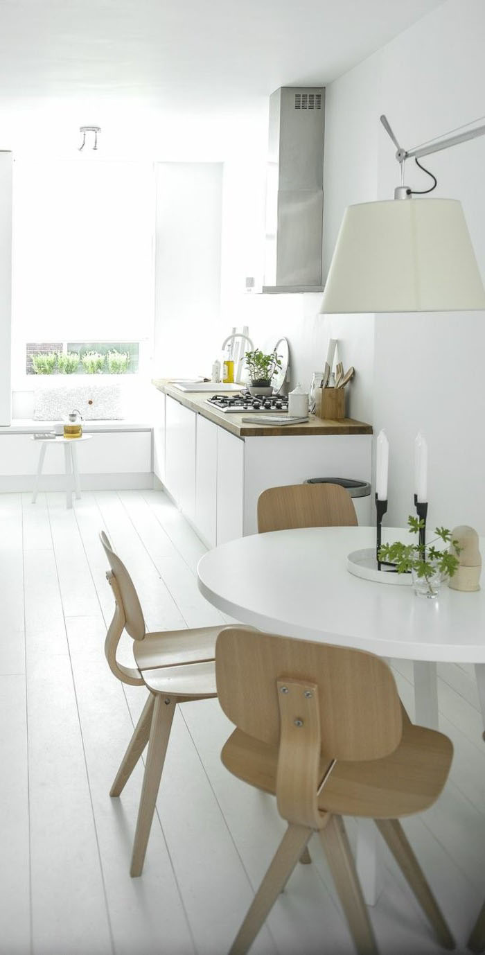 © Archzine Une autre belle cuisine d’un blanc vif sur le sol comme sur les meubles et les murs. Nous remarquons les belles chaises design.